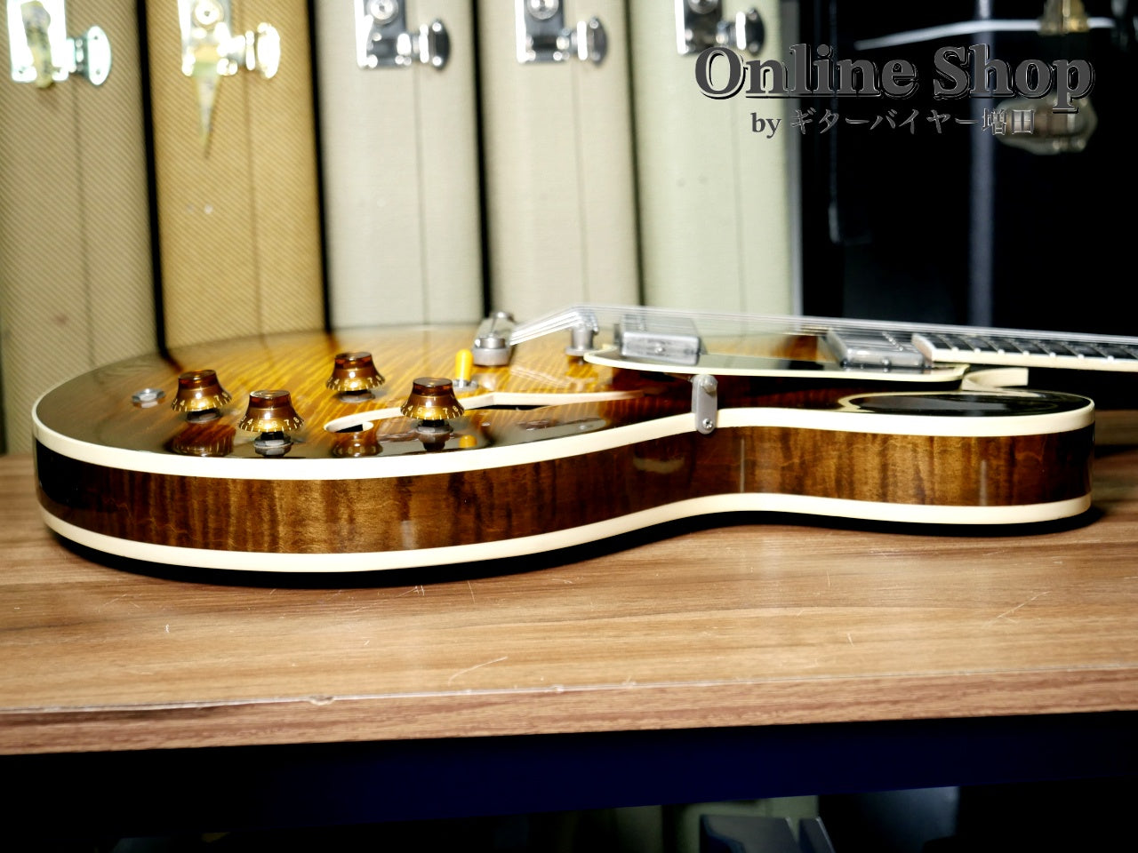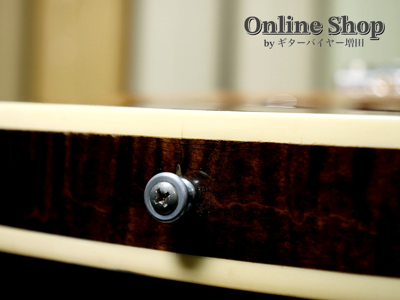 基本的な構造は当時のES-335リイシューモデルに準じていますが、最たる特徴はボディ全面に広がるフィガード!サイド、バックまで隙のない美しさで、それを生かしたやや淡いヴィンテージ・サンバースト・カラーに、Fホールの淵にもバインディングが施され、指板はエボニーを採用するなど非常に高級感のある仕上がりです。