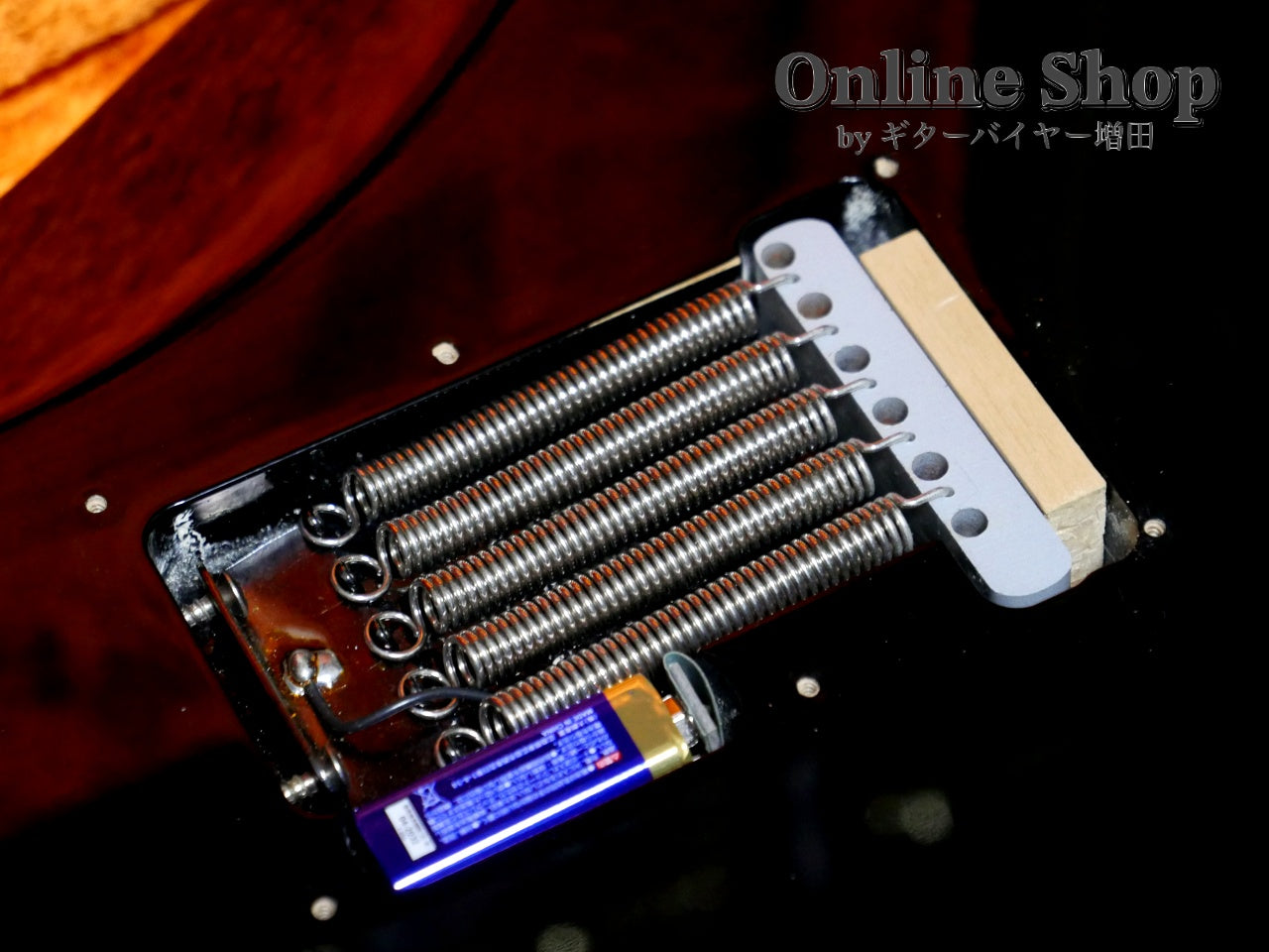 木材で固定されたトレモロ・ユニットによるニュアンスも当モデルならでは。経年によりピックガードに色やけ、使用に伴う擦り傷や打痕など年式相応に見受けられますが、もちろんプレイアビリティは申し分ない一品です。