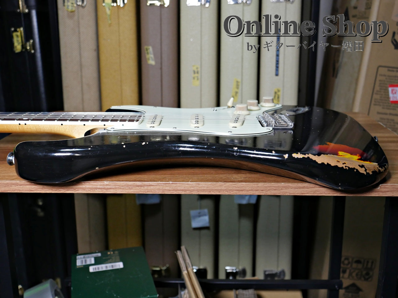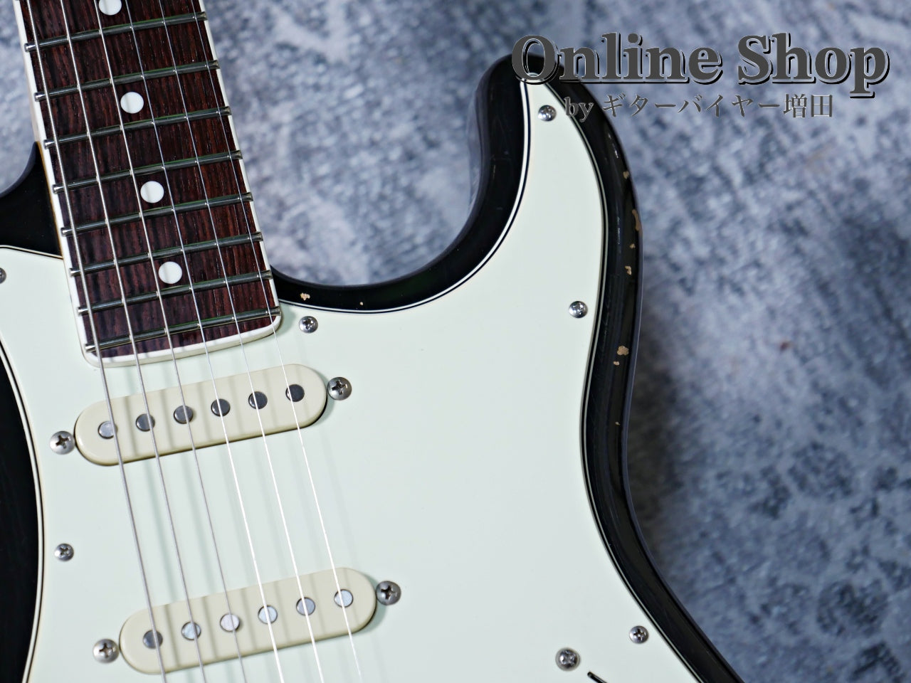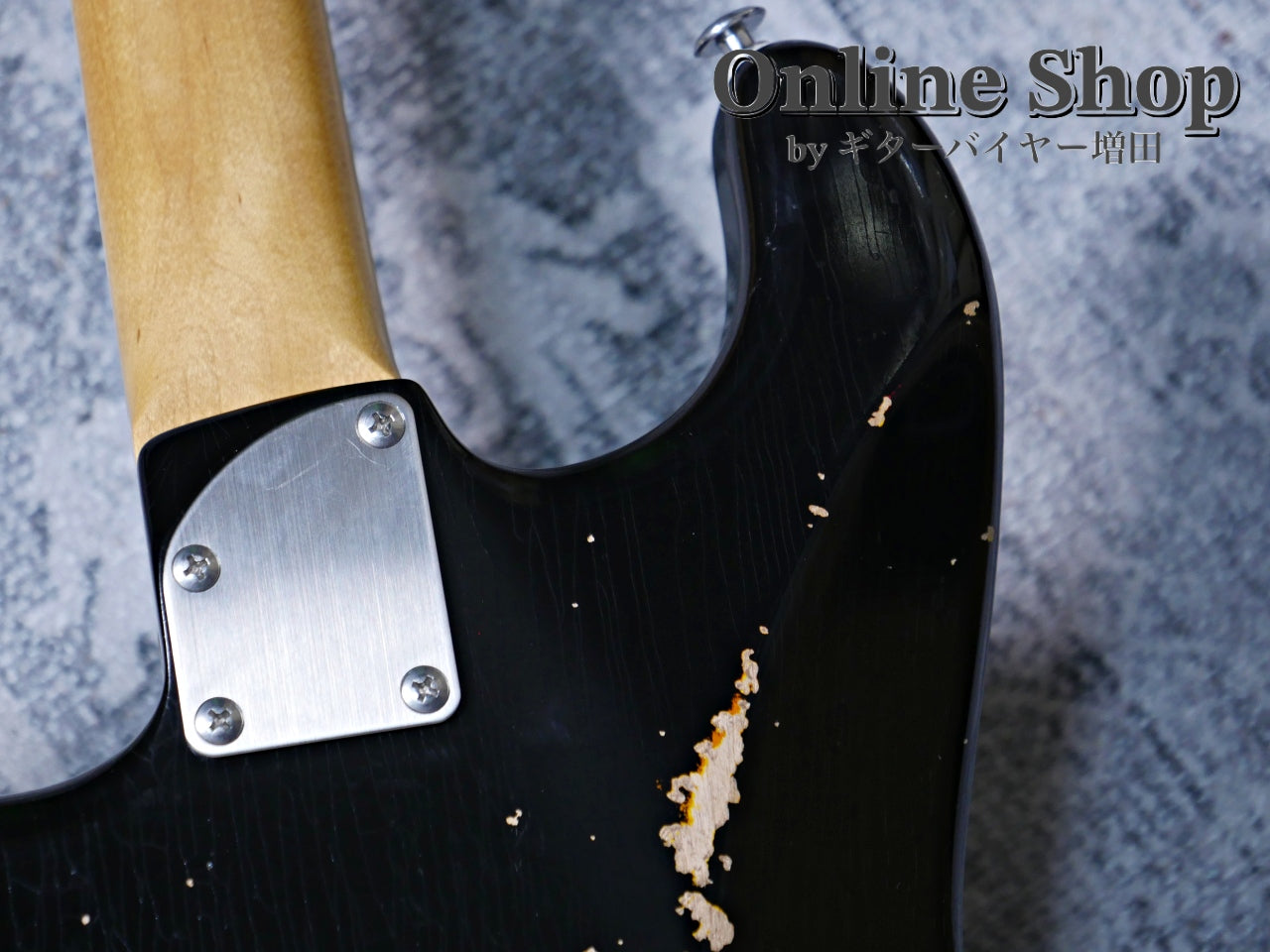 トラディショナルな内容のストラトタイプ"シグマ"。中でも特別な仕様を踏襲した個体で、サンバーストの上からブラックを吹いた"マルチ・レイヤー”をヘヴィ・レリックで仕上げられ、エルボー部分からはそのサンバーストが顔を出しています。