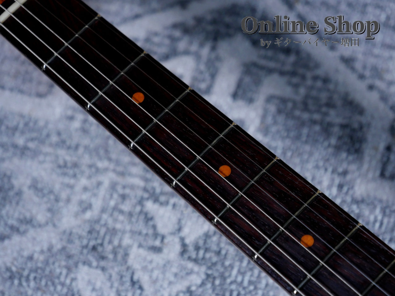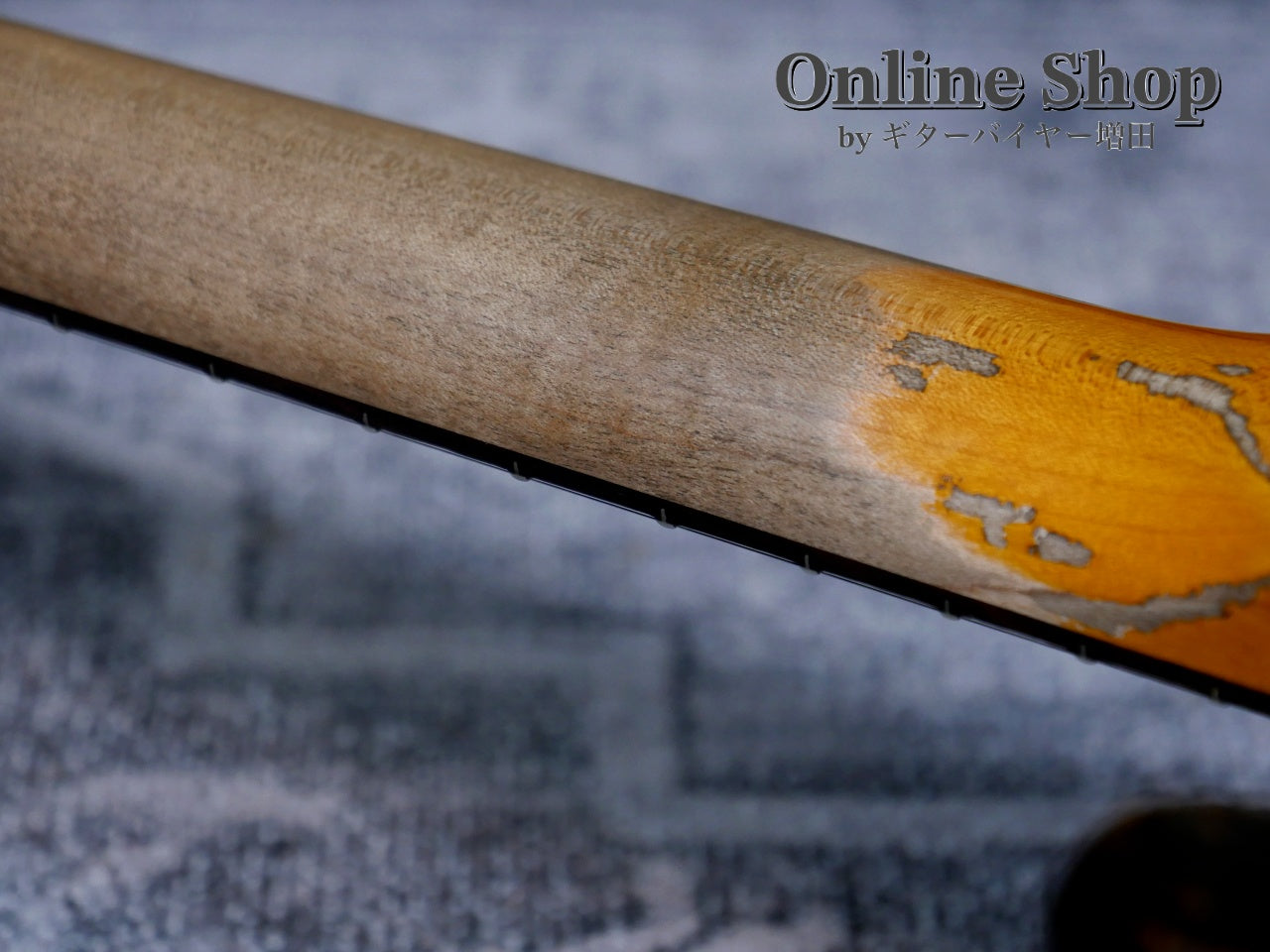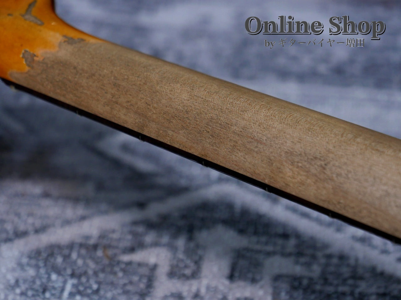 凄まじい貫禄のレリック仕上げ、リムは僅かにブラウンがかったチョコレート・ブラウンのサンバースト。アルダー・ボディにクオーターソーン・(柾目)メイプルネック、スラブ貼りのローズウッド指板。ネックはややUに近いしっかりとした握り心地のラージCシェイプ、9.5インチラディアスにフレットは6100ジャンボサイズで非常にモダンな演奏性です。