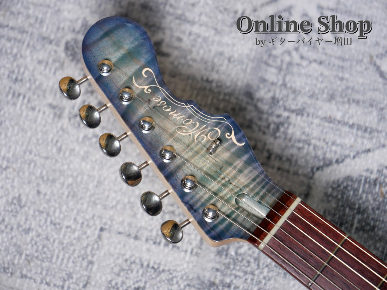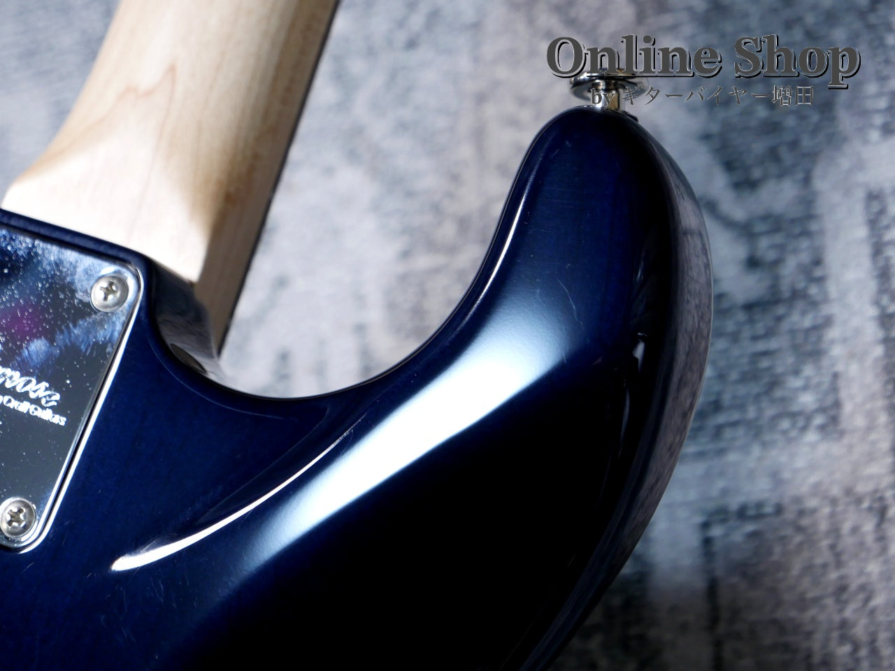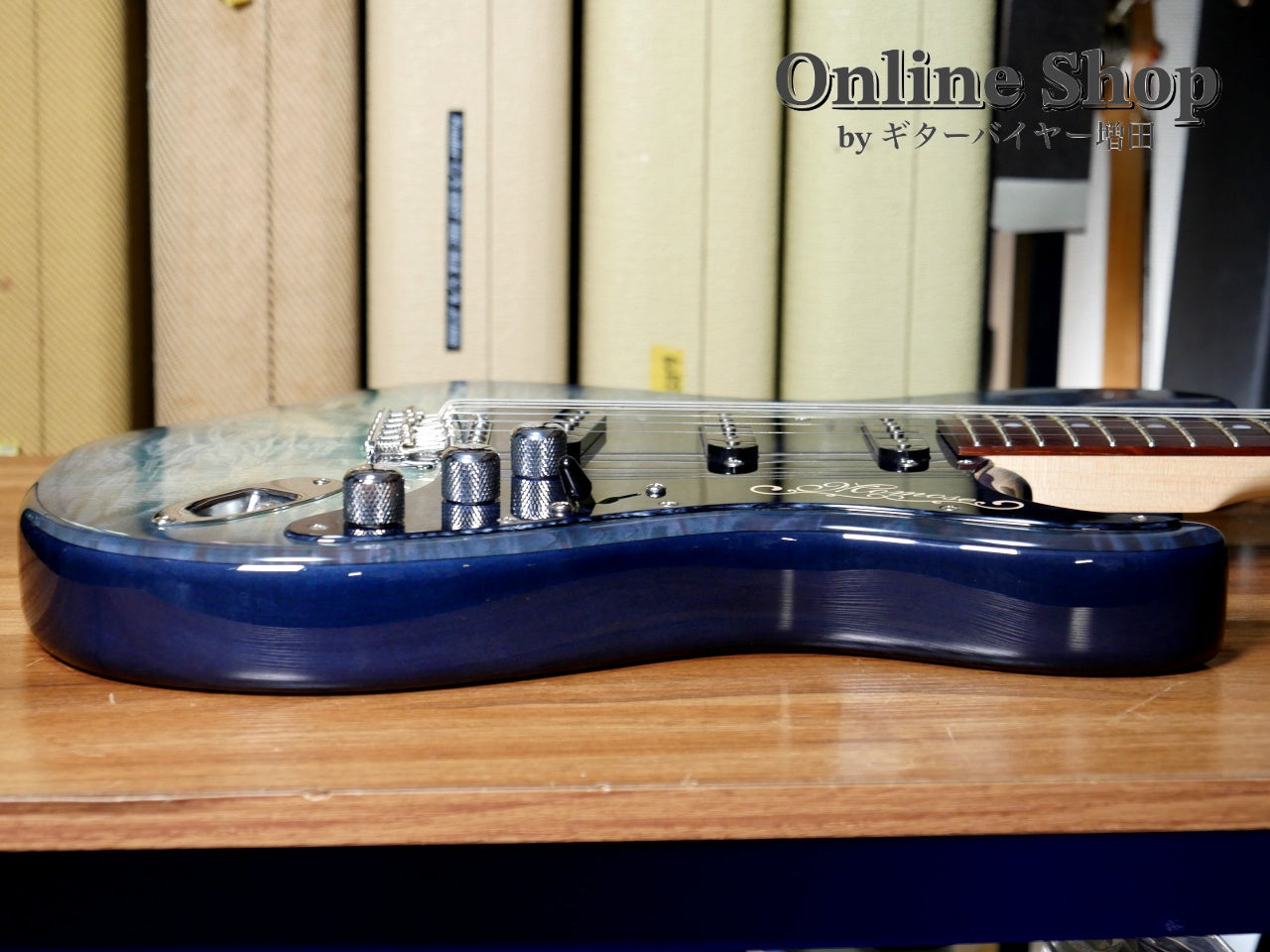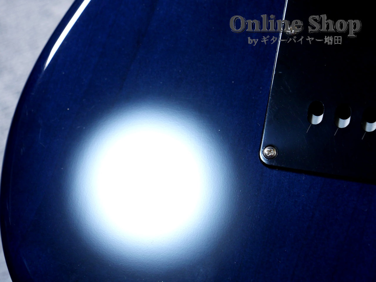 ネックはメイプル、指板はマダガスカル・ローズウッド。ボディにはトチを採用し、トップには非常に美しい杢を持つトチを貼り合わせ、その風合いを活かしたダークブルー・バーストに仕上げられており、ロゴを入れたピックガードも同色で合わせられています。