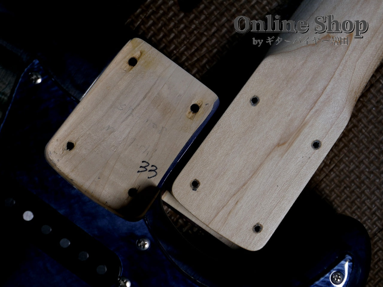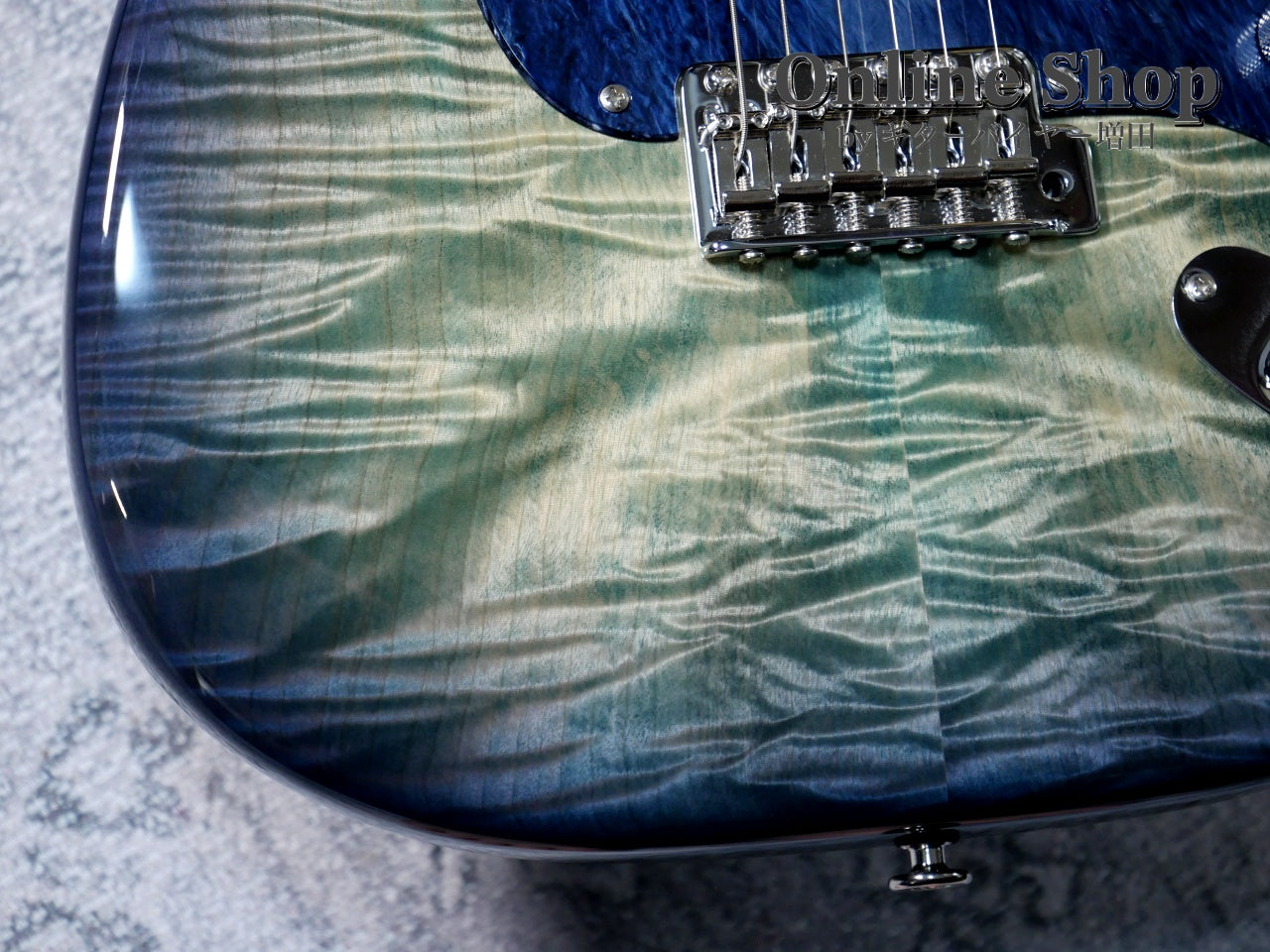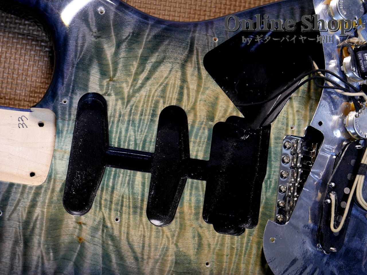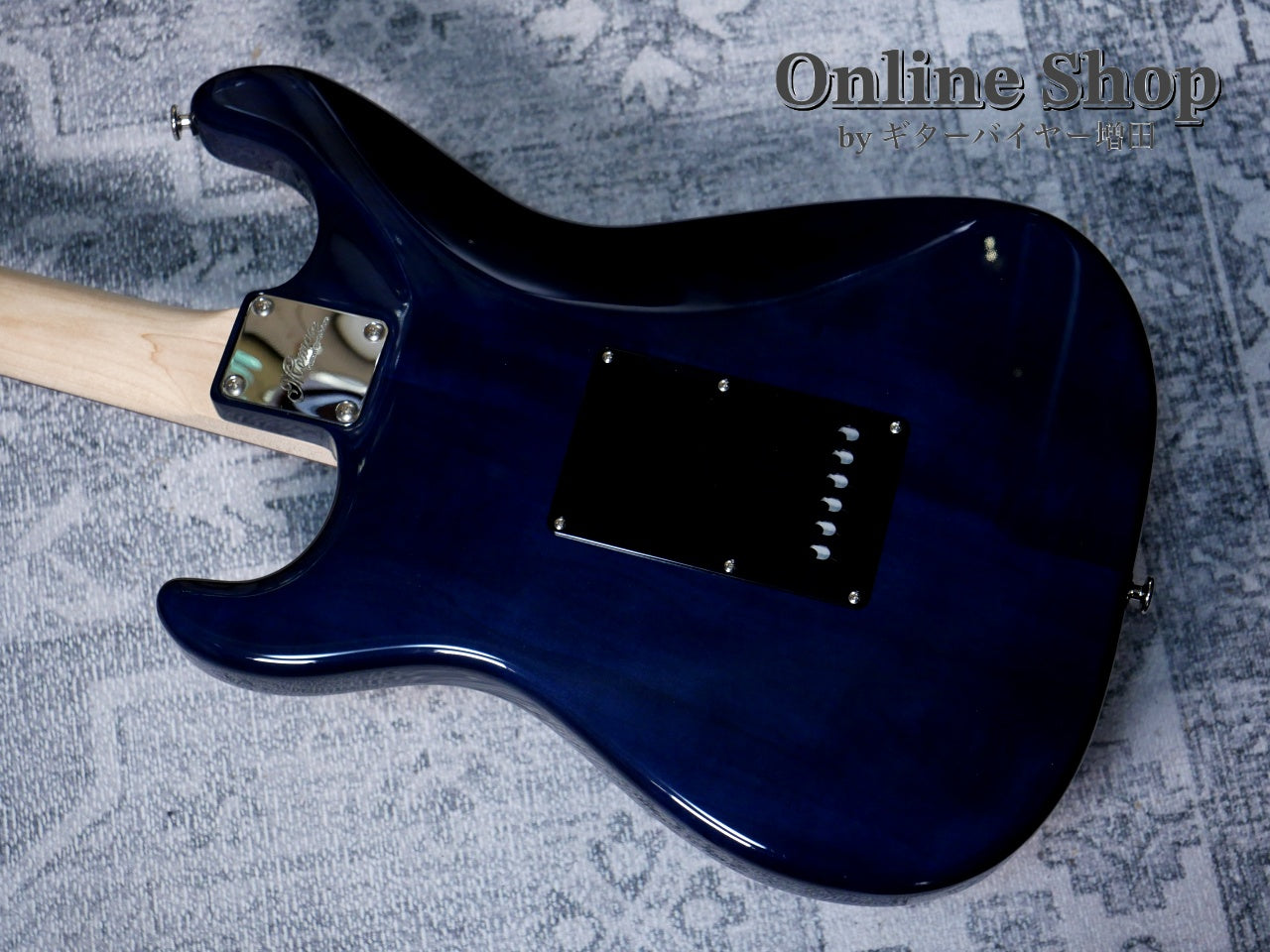 ネックはメイプル、指板はマダガスカル・ローズウッド。ボディにはトチを採用し、トップには非常に美しい杢を持つトチを貼り合わせ、その風合いを活かしたダークブルー・バーストに仕上げられており、ロゴを入れたピックガードも同色で合わせられています。
