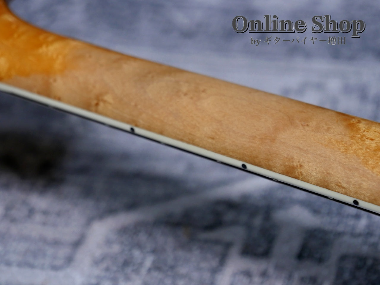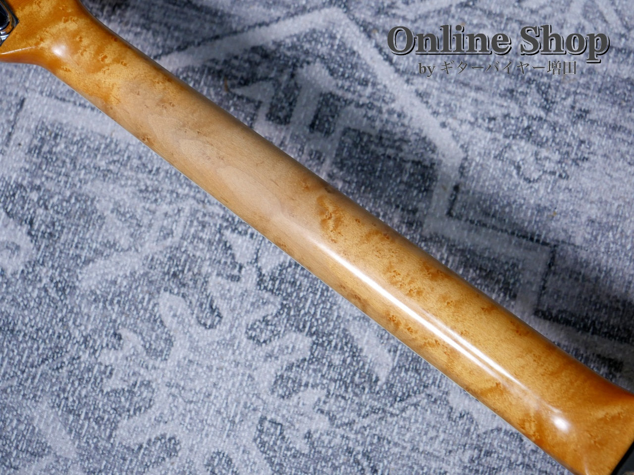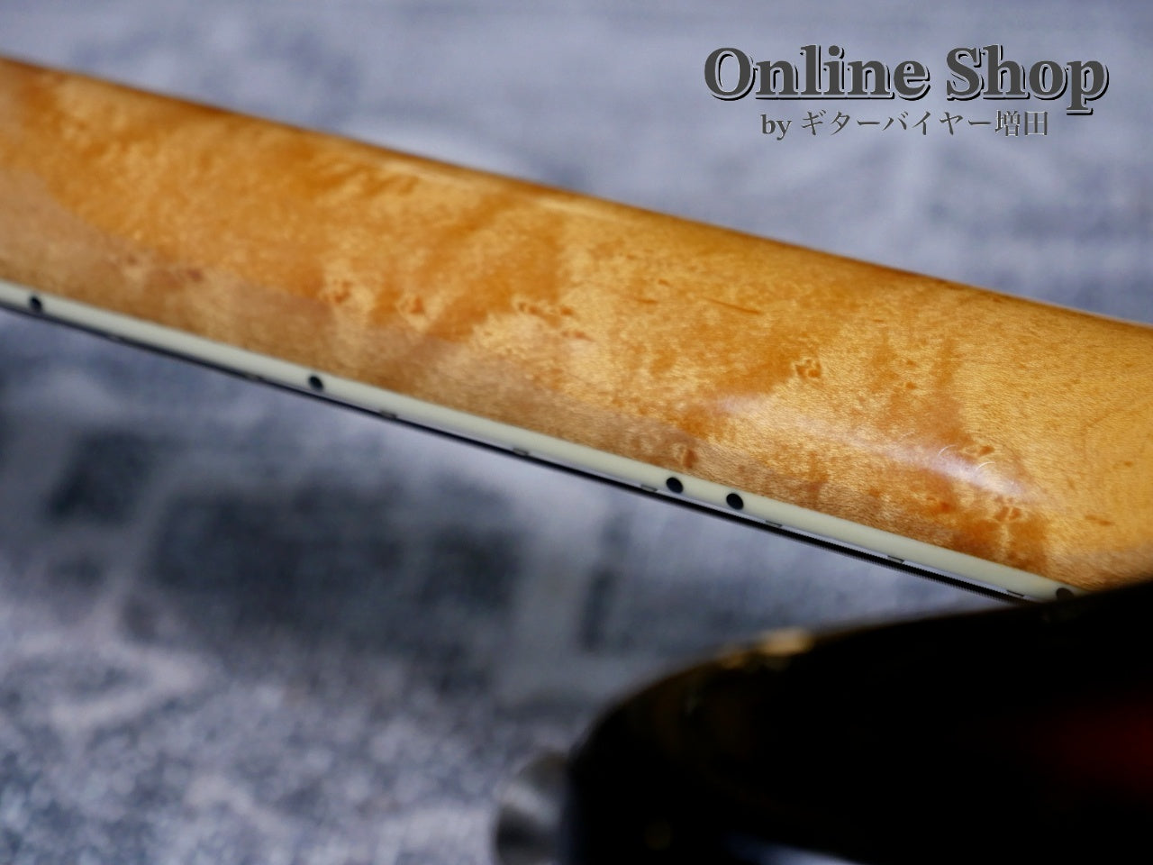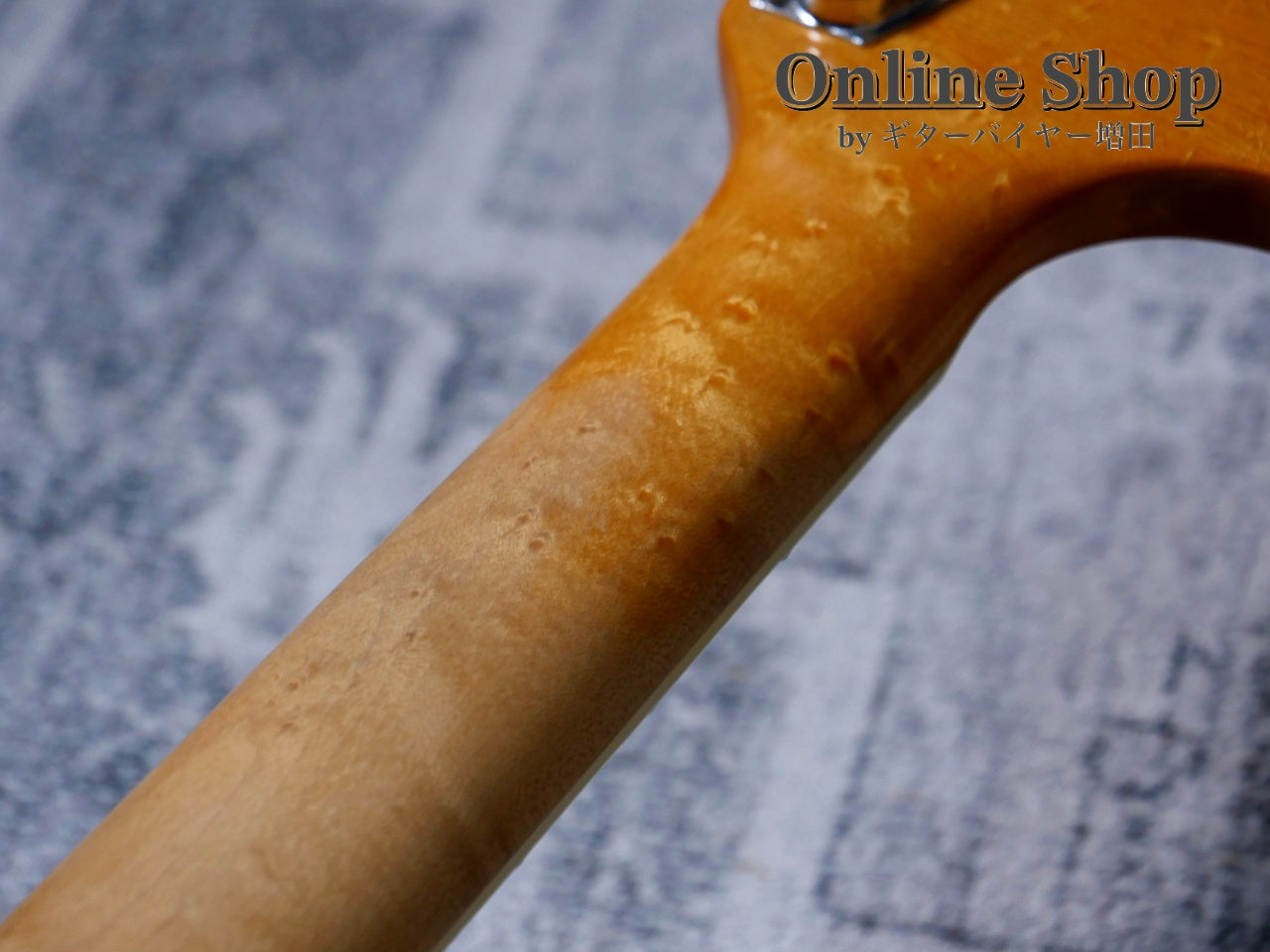 ネックはハイポジションまで比較的薄め、最低限の指板修正がされておりますがラディアスは7.25インチ、リフレット済のフレットはヴィンテージサイズですが十分な高さがありスムースな演奏性です。